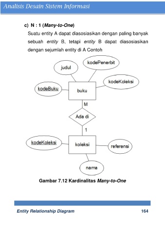 c) N : 1 (Many-to-One) Suatu entity A dapat diasosiasikan dengan paling banyak sebuah entity B, tetapi entity B dapat diasosiasikan dengan sejumlah entity di A Contoh Gambar 7.12 Kardinalitas Many-to-One Entity Relationship Diagram 164
